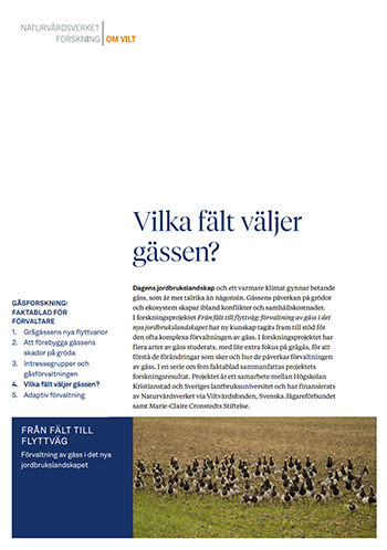 Dagens jordbrukslandskap och ett varmare klimat gynnar betande gäss, som är mer talrika än någonsin. Gässens påverkan på grödor och ekosystem skapar ibland konflikter och samhällskostnader. I forskningsprojektet Från fält till flyttväg: förvaltning av gäss i det nya jordbrukslandskapet har ny kunskap tagits fram till stöd för den ofta komplexa förvaltningen av gäss. I en serie om fem faktablad sammanfattas projektets forskningsresultat.