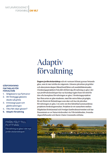 Dagens jordbrukslandskap och ett varmare klimat gynnar betande gäss, som är mer talrika än någonsin. Gässens påverkan på grödor och ekosystem skapar ibland konflikter och samhällskostnader. I forskningsprojektet Från fält till flyttväg: förvaltning av gäss i det nya jordbrukslandskapet har ny kunskap tagits fram till stöd för den ofta komplexa förvaltningen av gäss. I en serie om fem faktablad sammanfattas projektets forskningsresultat.